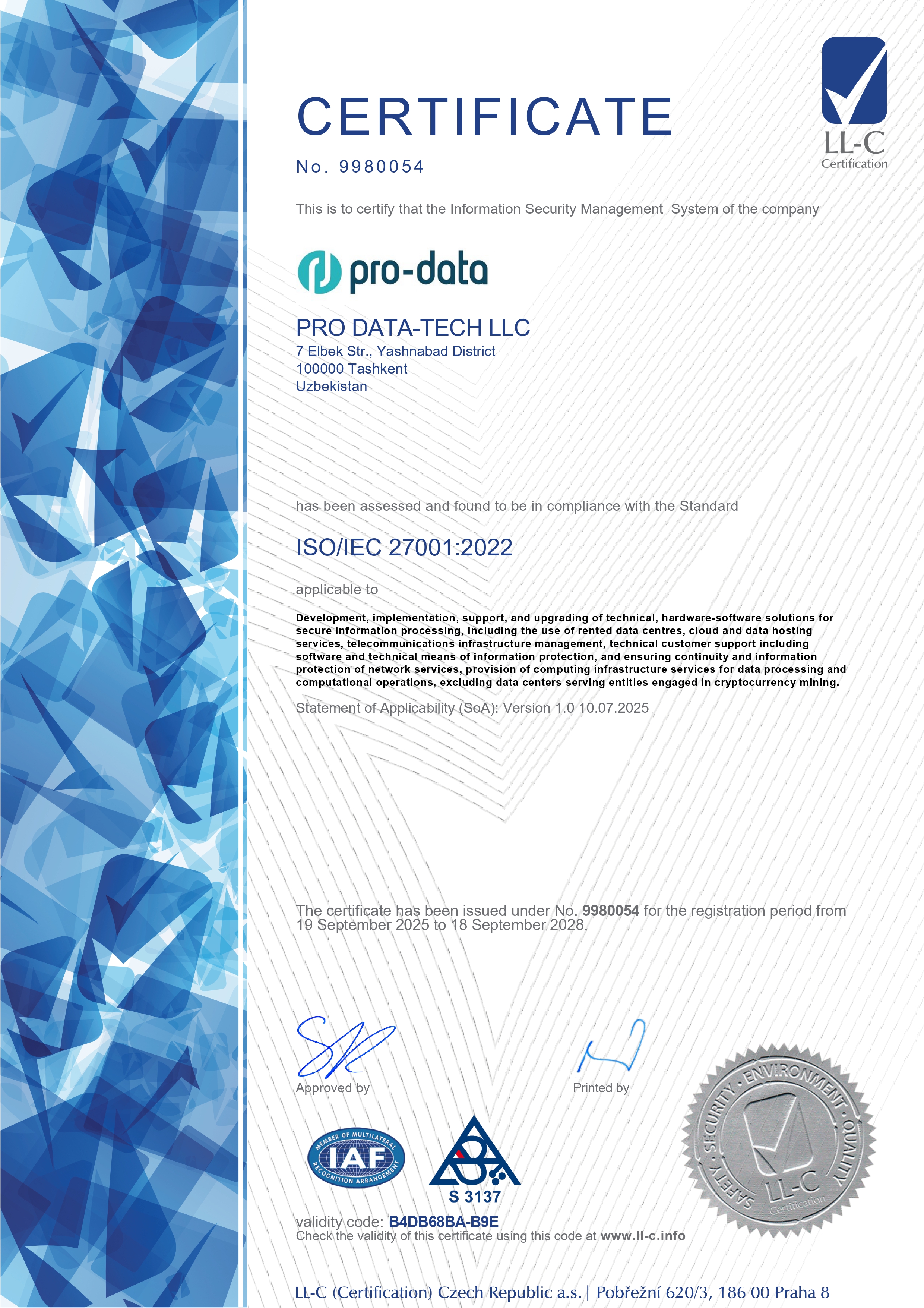 ISO 27001 подтверждает, что процессы и инфраструктура Pro-Data соответствуют мировым требованиям по защите данных и обеспечению надежности сервисов. Для наших заказчиков это гарантия, что данные в облаке Pro-Data защищены по международным стандартам, а процессы безопасности регулярно контролируются и подтверждены сертификацией.